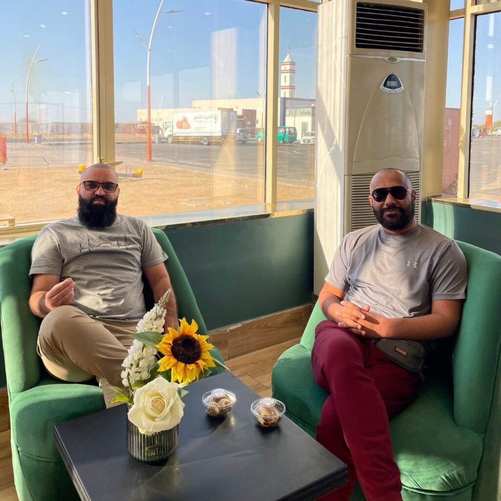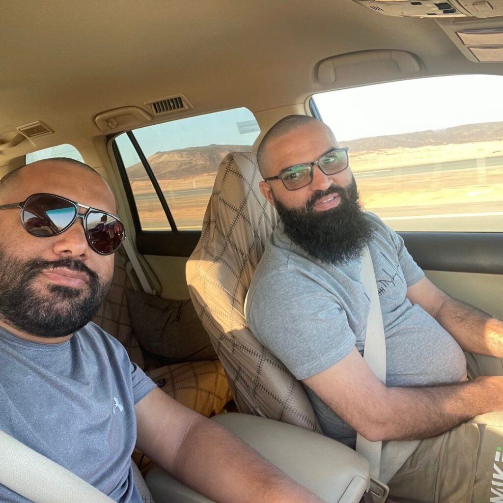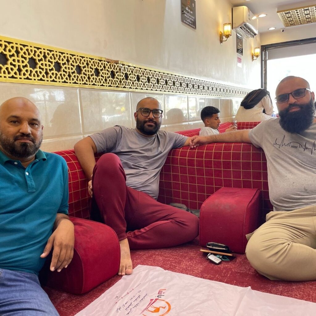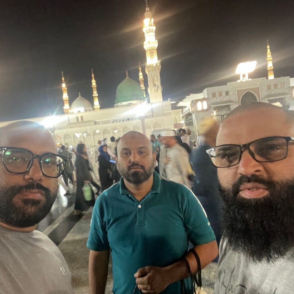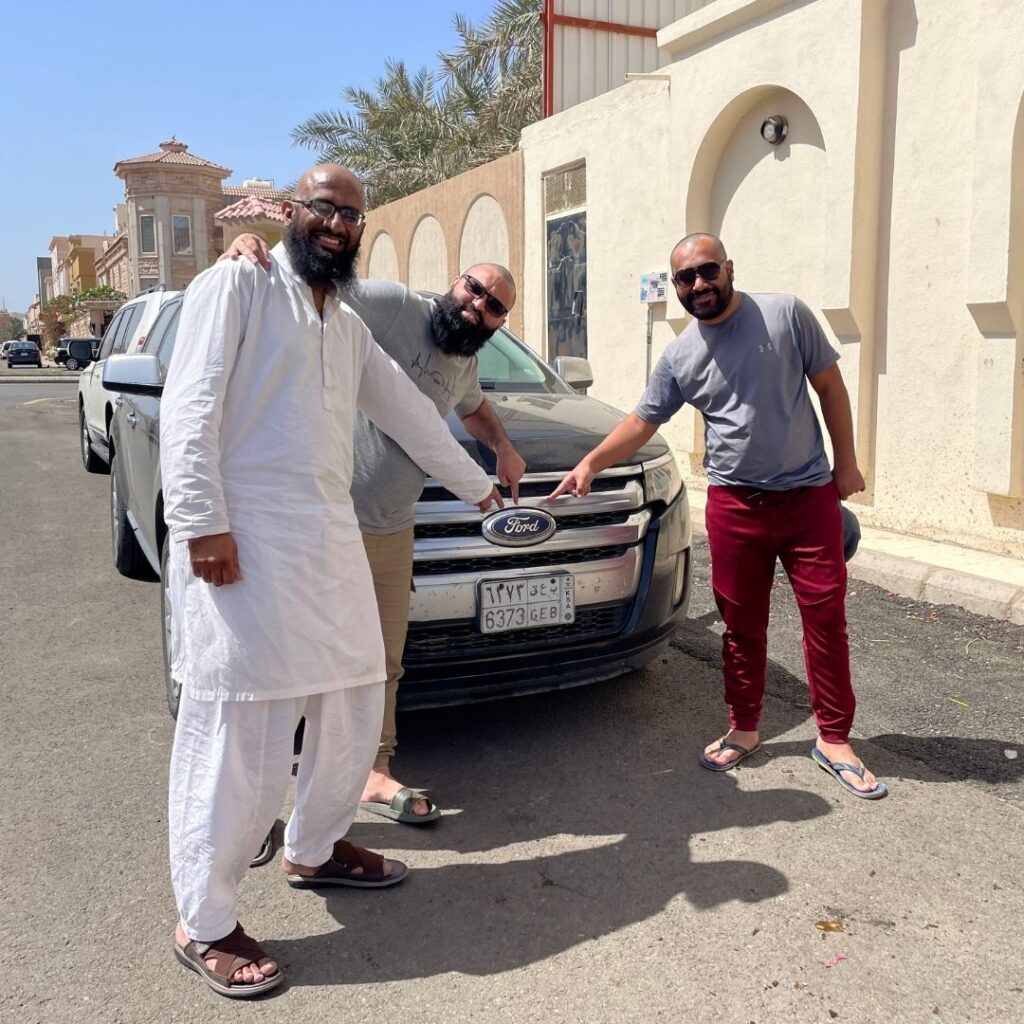 بالآخر ہم مدینہ پہنچے اور سیدھے اس لوکیشن پر گئے جو ہمارے دوست کمال نے ہمیں بھیجی تھی۔ کمال سے کئی برس بعد ملاقات ہو رہی تھی، اس لیے گلے ملنے کے بعد دیر تک گپ شپ چلتی رہی۔ کمال کے پاس پہنچتے ہی ہم نے اُس کی فورڈ کے ساتھ ایک یادگار تصویر لی، جو خاص طور پر پاکستان میں موجود اپنے دوستوں—فیضان، ریحان اور سلمان شیخ—کے لیے تھی۔ یہ سب اپ ڈیٹس ہم ساتھ ساتھ اپنے ‘فرینڈز فارایور’ گروپ میں بھیجتے رہے تاکہ وہ بھی اس سفر کا حصہ محسوس کریں۔ کمال نے بتایا کہ وہ اپنی فیملی کے ساتھ ایک لگژری اپارٹمنٹ میں ٹھہرا ہوا ہے، اور خوش قسمتی سے وہاں ایک کمرہ خالی ہے، اس لیے ہمیں ہوٹل بک کرنے کی ضرورت نہیں۔ یوں ہم تینوں کے لیے بہترین قیام کا بندوبست ہو گیا۔ کمال کے بڑے بھائی جمال بھائی سے بھی ملاقات ہوئی، اور پرانی یادیں تازہ ہو گئیں۔
