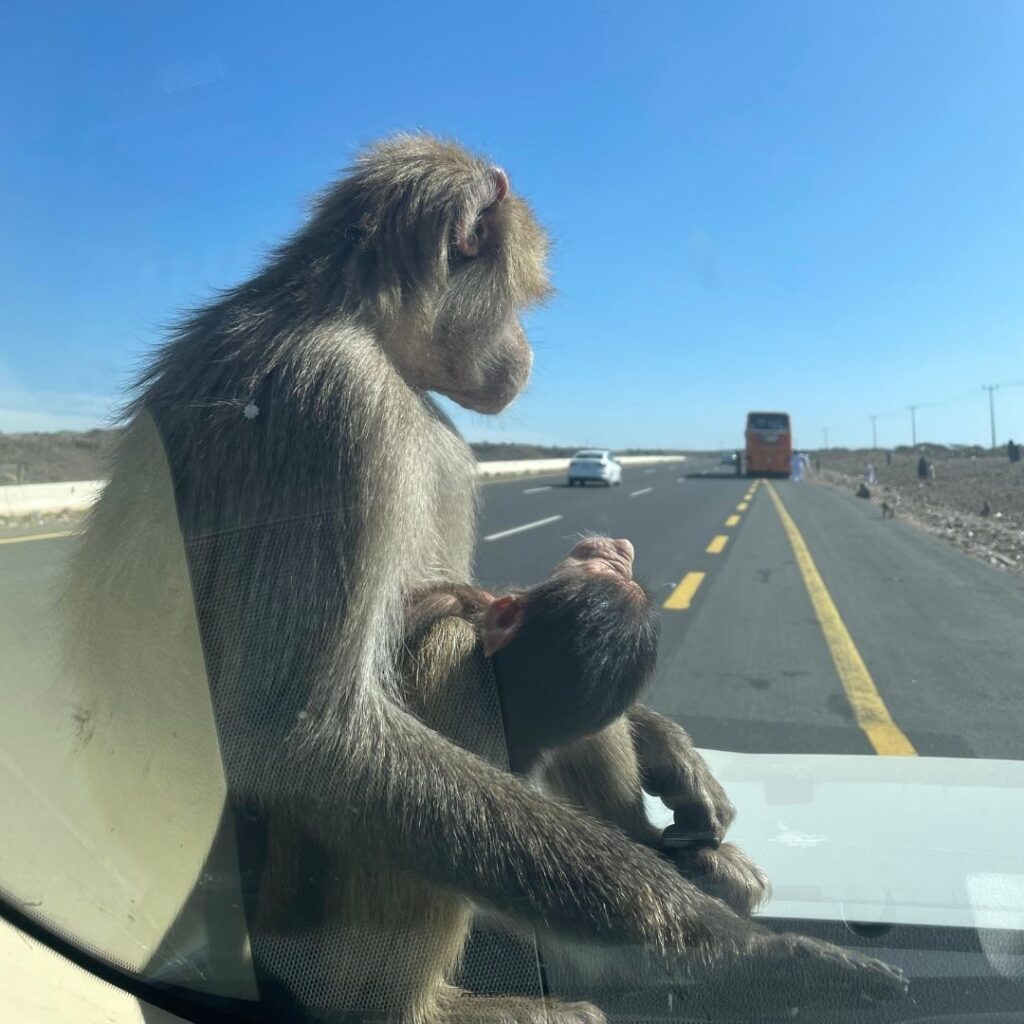 راستے میں مختلف شہر آتے گئے۔ آگے بڑھتے ہوئے بدر اور رابغ جیسے تاریخی مقامات کے بورڈ دکھائی دیے تو دل نے ان جگہوں کی عظمت کو محسوس کیا۔ سفر کے دوران سب سے دلچسپ لمحہ وہ تھا جب ہم ایک ایسے مقام پر رکے جہاں سڑک کے کنارے درجنوں بندر کھیل رہے تھے۔ جیسے ہی گاڑی روکی تو چند شرارتی بندر بونٹ پر چڑھ گئے۔ ہم نے تصاویر بھی بنائیں اور قہقہوں کے بعد سفر دوبارہ شروع کر دیا۔